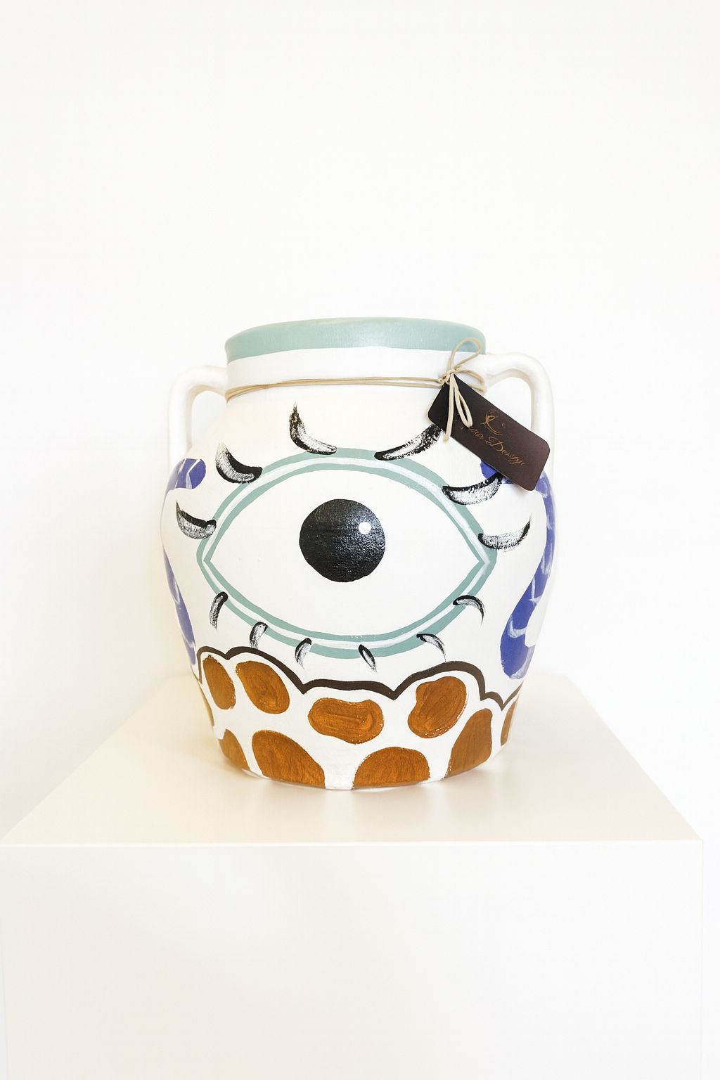 El yapımı, özgün tasarımlı seramik vazo. Üzerindeki modern 'Göz' motifi, geleneksel nazar sembolünden ilham alınmıştır.